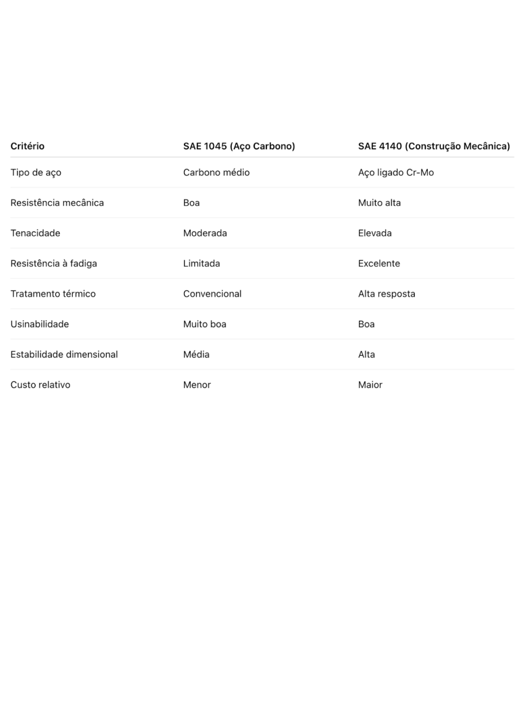 Enquanto o SAE 1045 atende bem aplicações mais simples, o SAE 4140 oferece maior margem de segurança, vida útil estendida e menor risco de falhas estruturais em situações críticas.