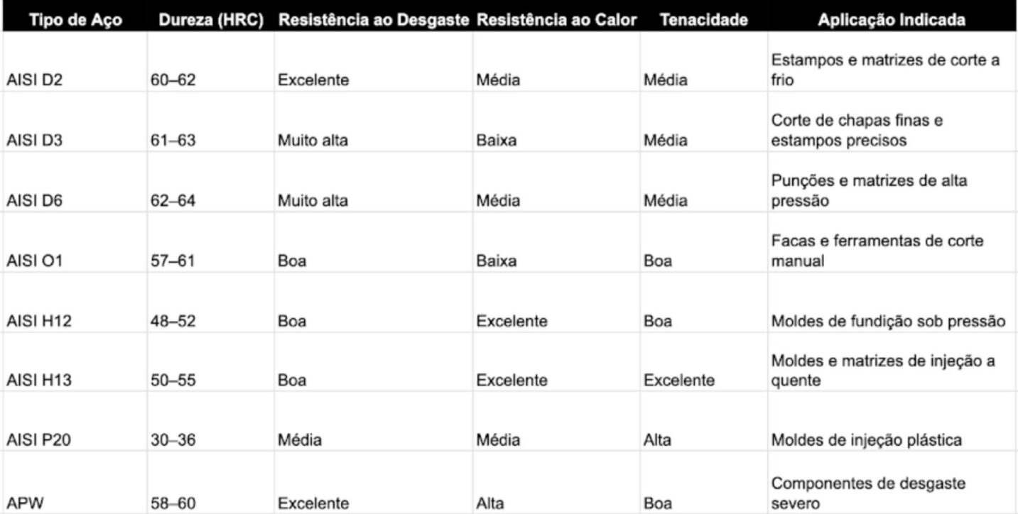 - APW Aço Prata Tungstênio – combina resistência ao desgaste e boa tenacidade, sendo indicado para moldes e componentes de alta precisão.