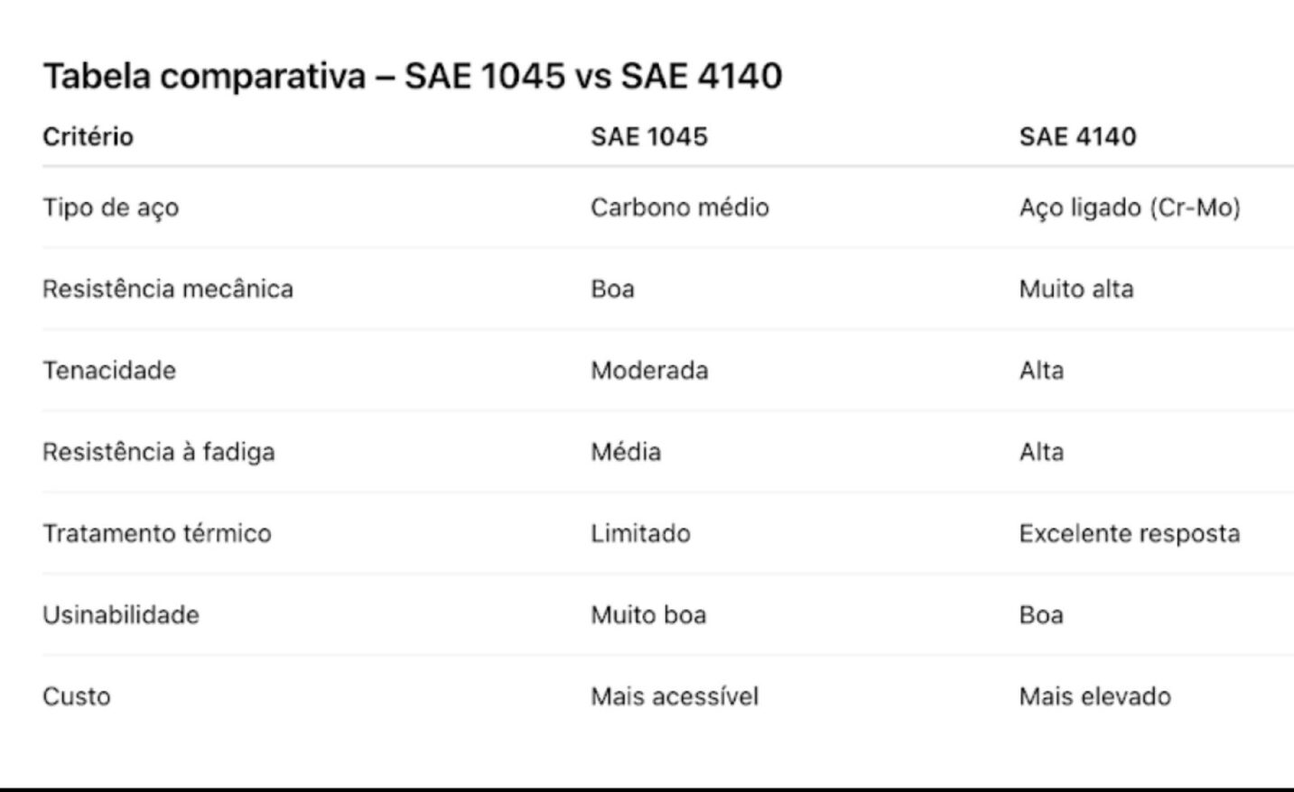 A comparação entre SAE 1045 e SAE 4140 evidencia que não existe um material “melhor” de forma absoluta, mas sim mais adequado para cada aplicação.